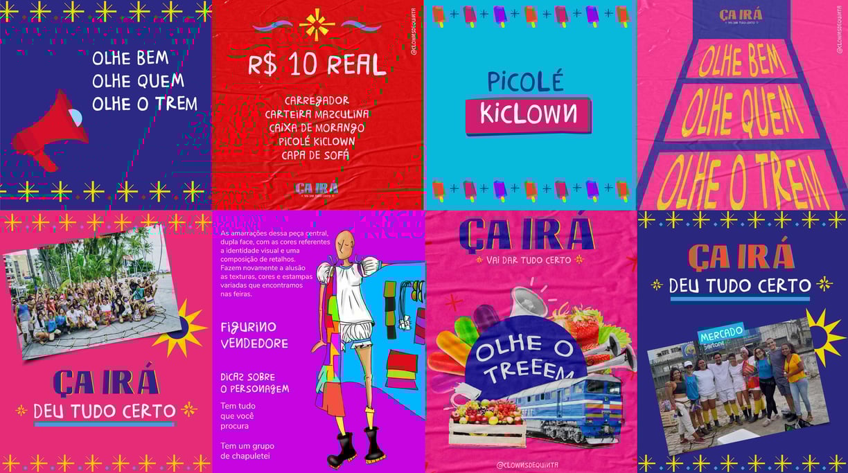 Ça Irá is a street performance that portrays street commerce, more specifically the street vending that takes place along the train tracks. Drawing inspiration from this simple form of commerce, the main reference for the visual identity came from the concept of vernacular design — the "street design", popular and handcrafted, associated with the handmade, simplicity, and a strong connection to local culture.