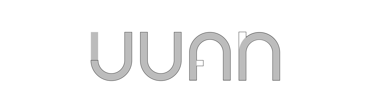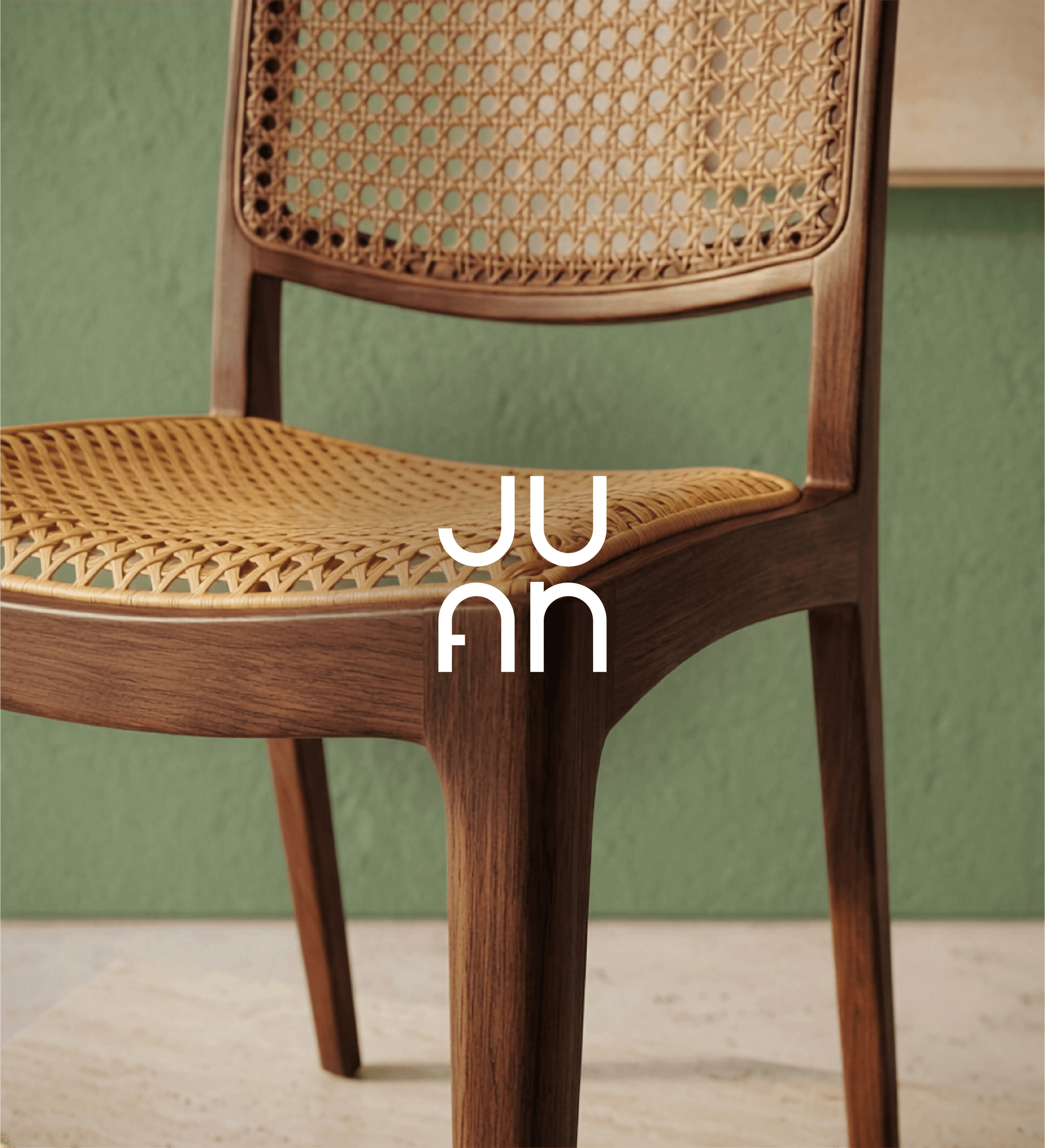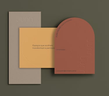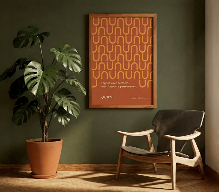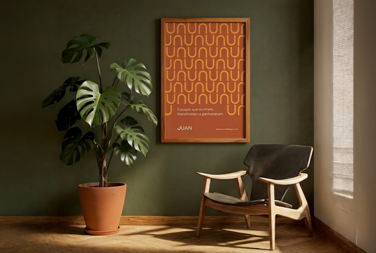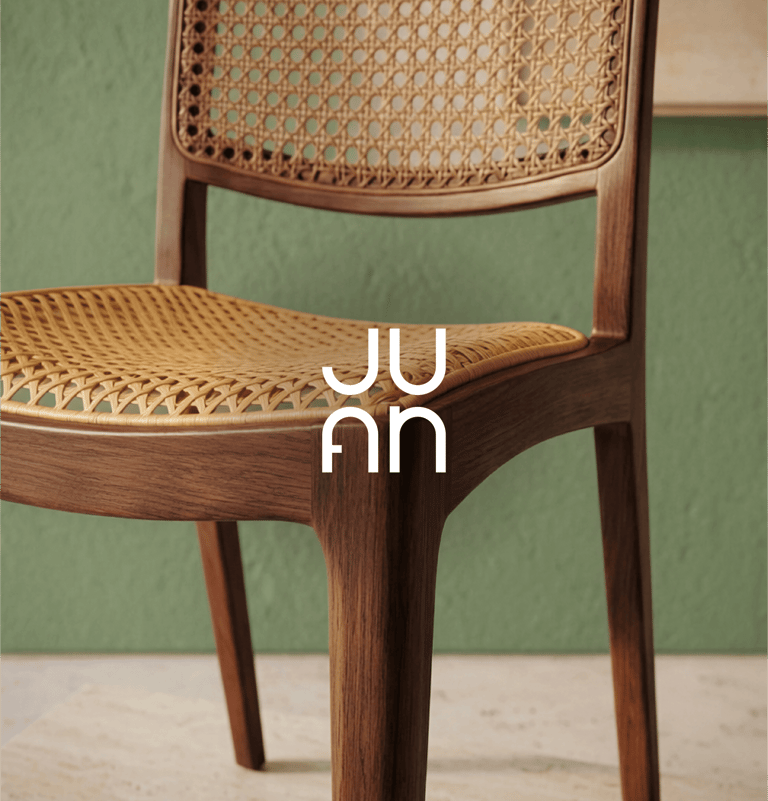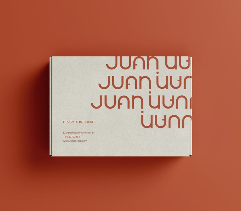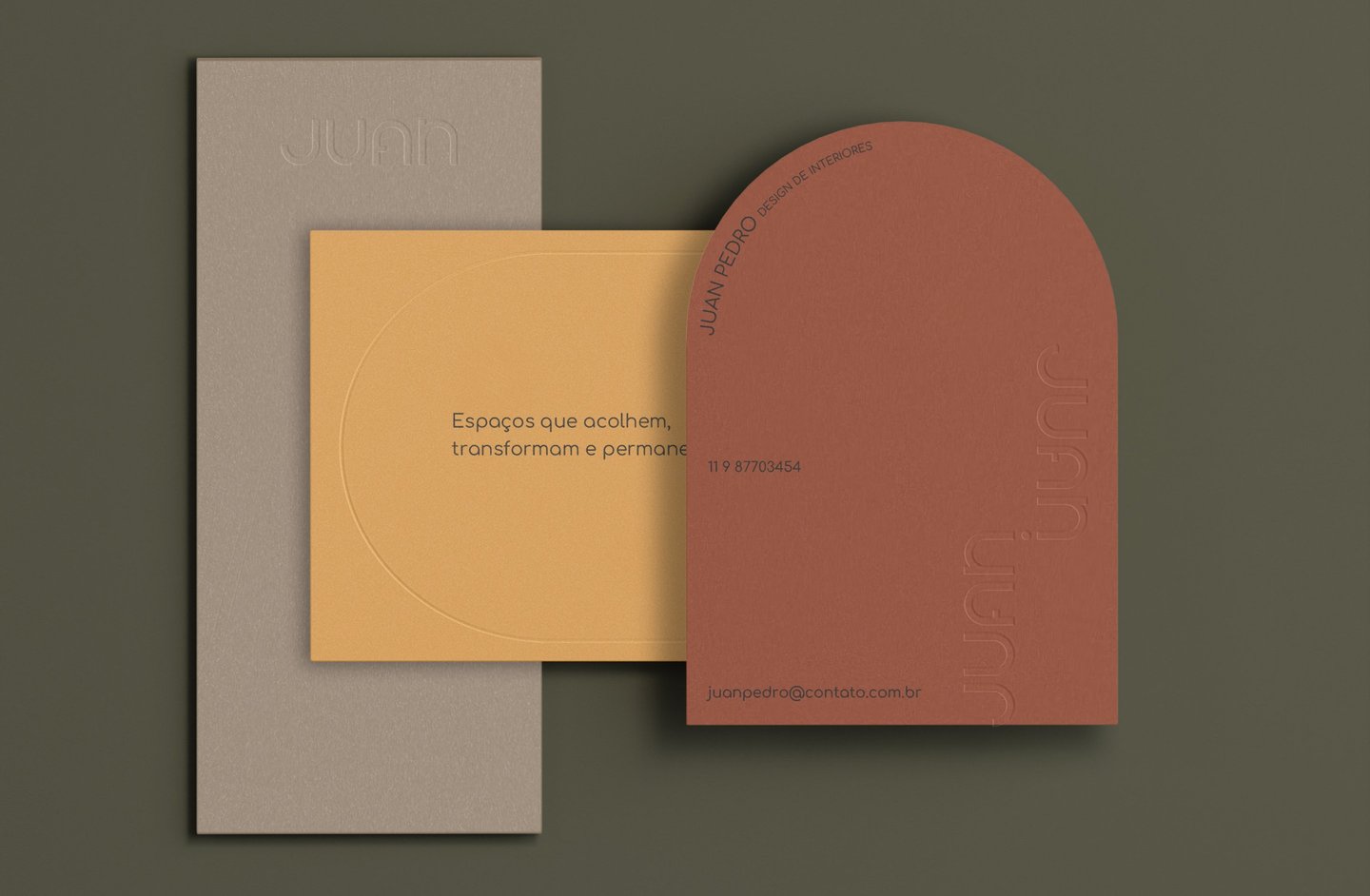A partir desse módulo, foi desenvolvido o desenho de todas as letras do nome “Juan”, criando unidade visual e ritmo na composição. Além de seu caráter geométrico, o arco também remete à ideia de entrada e abrigo, reforçando o vínculo da marca com o universo do lar e do acolhimento.