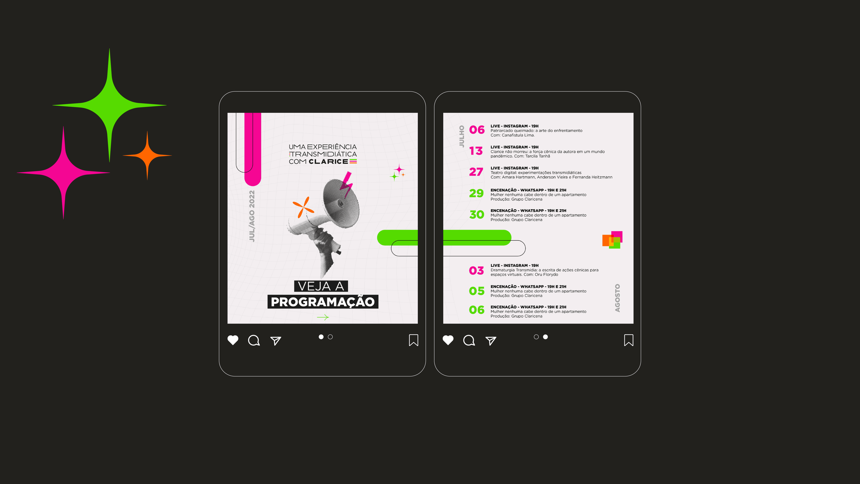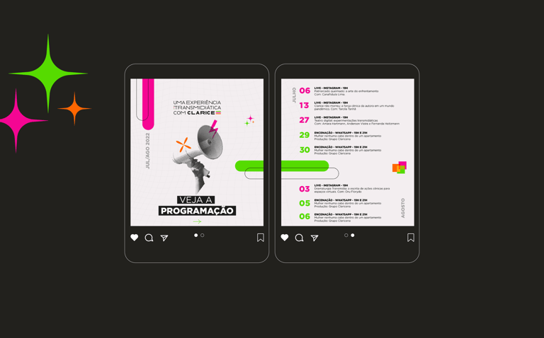 Each color was carefully chosen to communicate the specific role of each activity: pink represents the series of Instagram lives; green refers to the virtual performance of the text "No Woman Fits Inside an Apartment", carried out via WhatsApp; and orange is associated with the book of performances and research, published at the end of the cycle. Together, these colors and shapes express the fluid transition between activities and the immersive layers of Clarice Lispector's work.