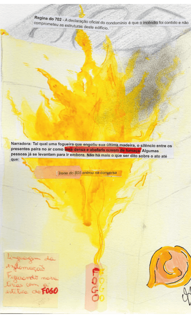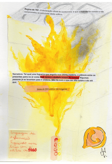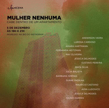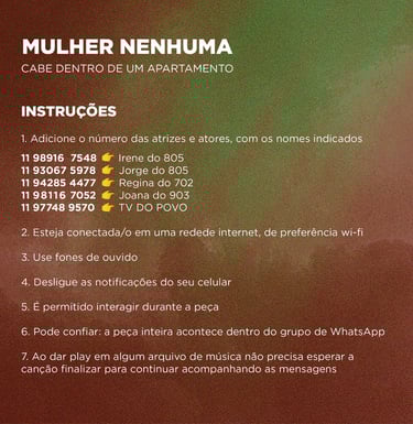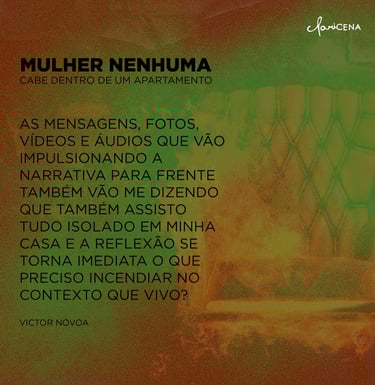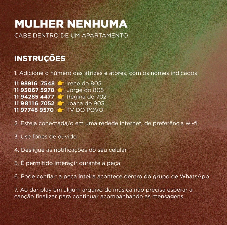 "No woman fits inside an apartment" is a virtual performance created during the pandemic, taking place on the WhatsApp platform. Based on the work Pecadora queimada e os anjos harmoniosos by Clarice Lispector, we follow the protagonist Irene, who, tired of having her life controlled by her building’s neighbors, commits an incendiary act in her apartment and disappears without a trace. The audience becomes immersed in the exchanged messages between the characters of this plot in a WhatsApp group, where they can choose to interact or not with the characters.